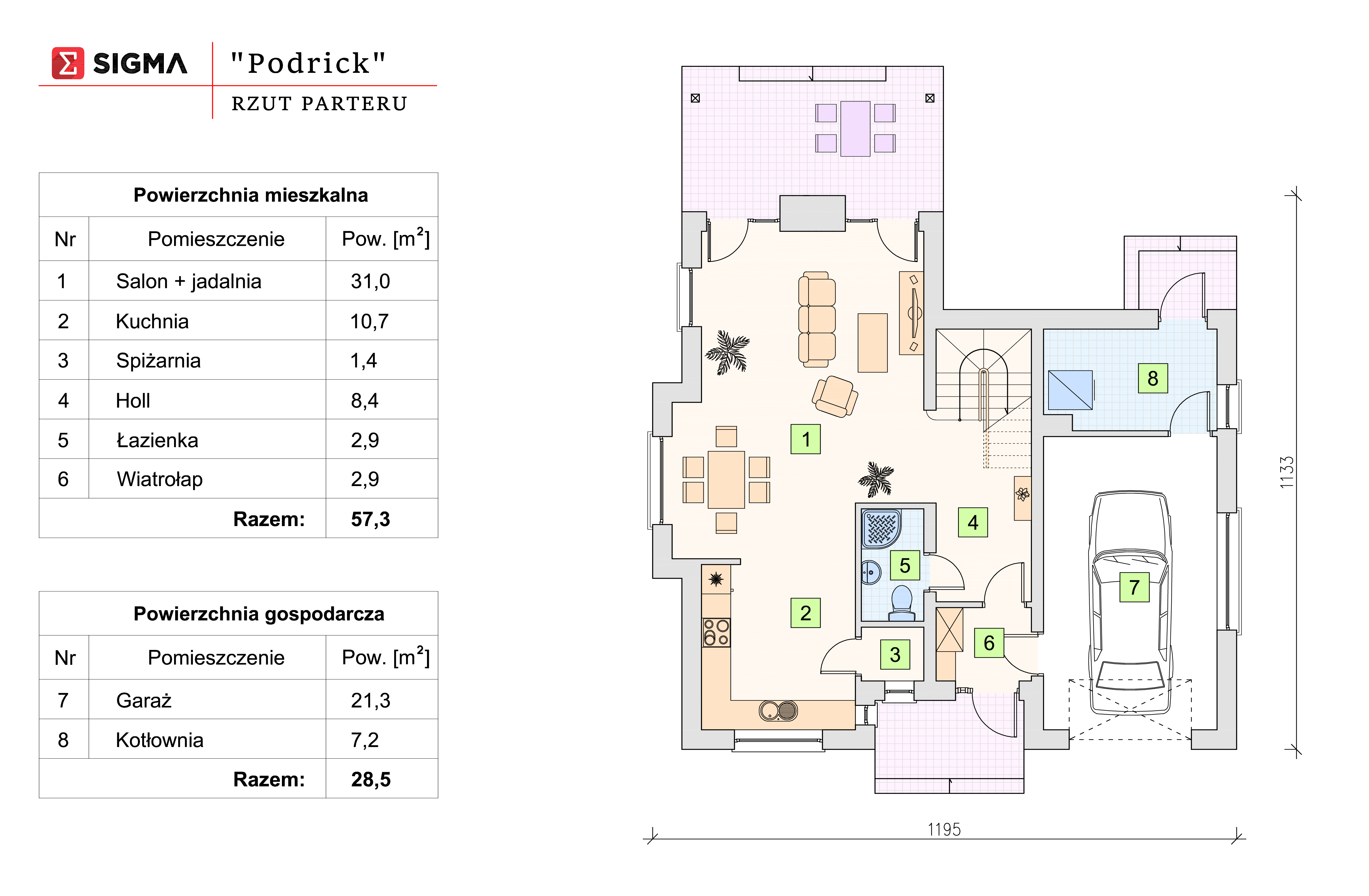 - powierzchnia mieszkalna na parterze 57,3 m2